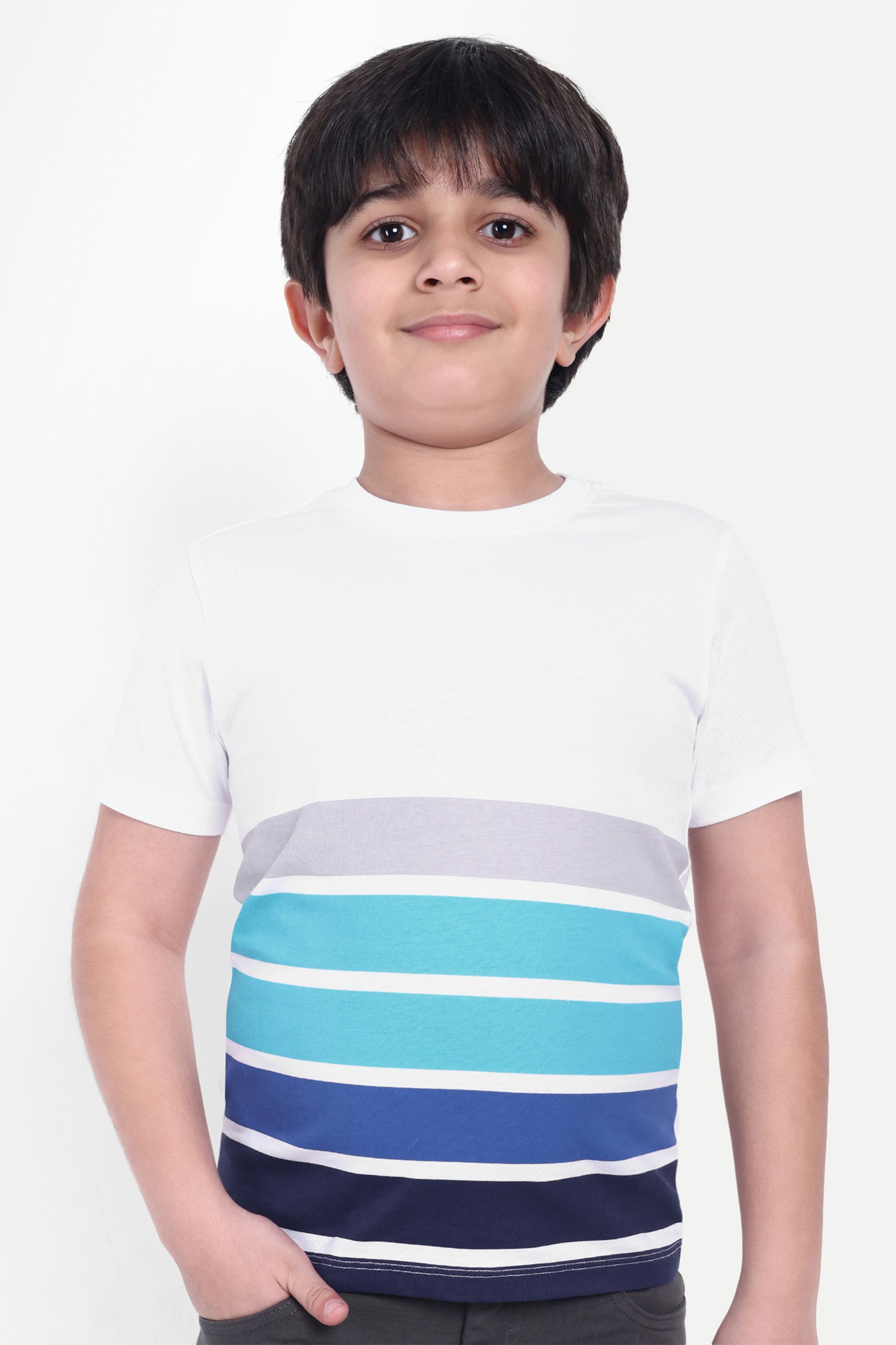 Introducing the Boys Stylish Round Neck T-shirt with Multi-Color Stripes, designed for both comfort and style. Made from 100% premium cotton, this T-shirt offers a soft, breathable feel that ensures all-day comfort for active kids. Featuring a trendy round neck and bold multi-color stripes, this piece is perfect for adding a pop of color to any casual outfit. Whether it's for school, playtime, or weekend outings, this T-shirt is a versatile addition to your child's wardrobe. Available in a range of sizes and color options to suit every taste, the Boys Stylish Round Neck T-shirt by One Sky combines durability with a fashionable flair. Ideal for easygoing, everyday wear.