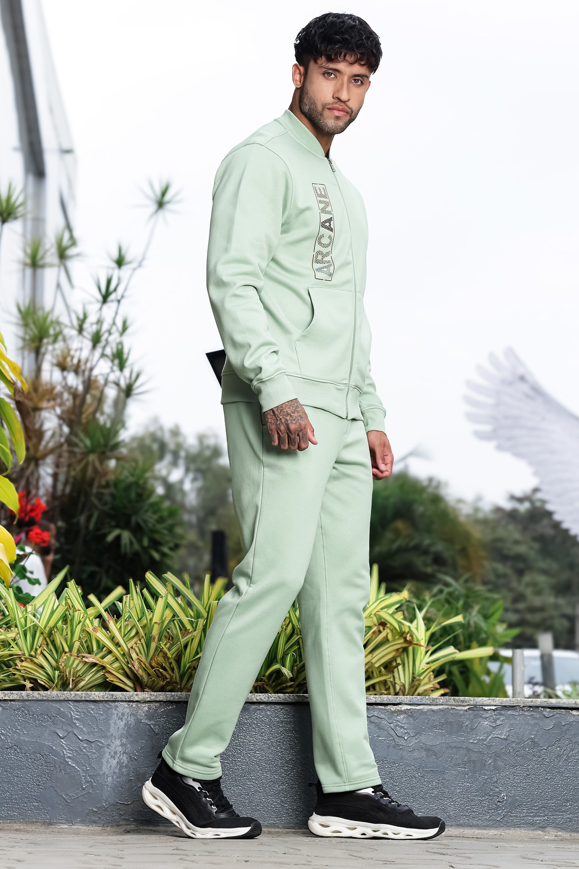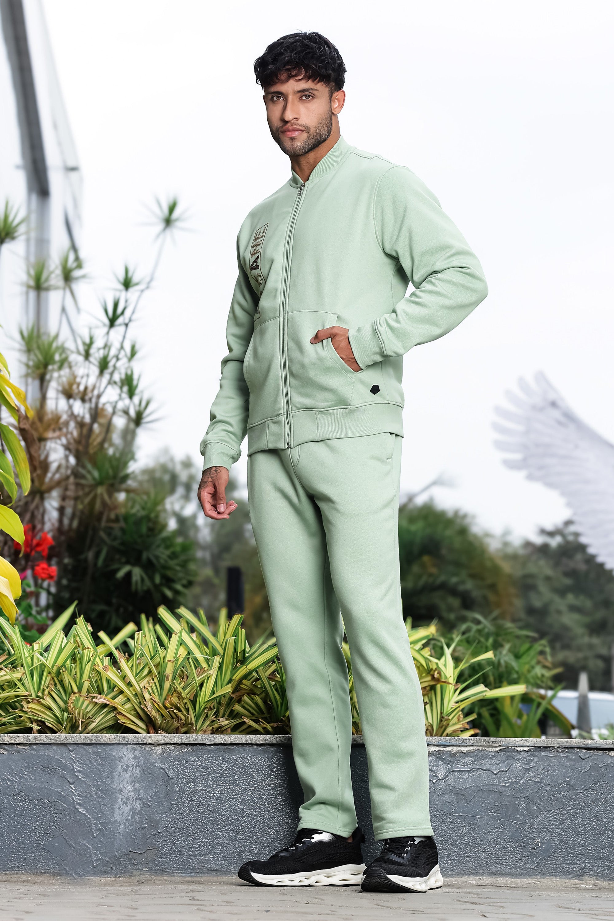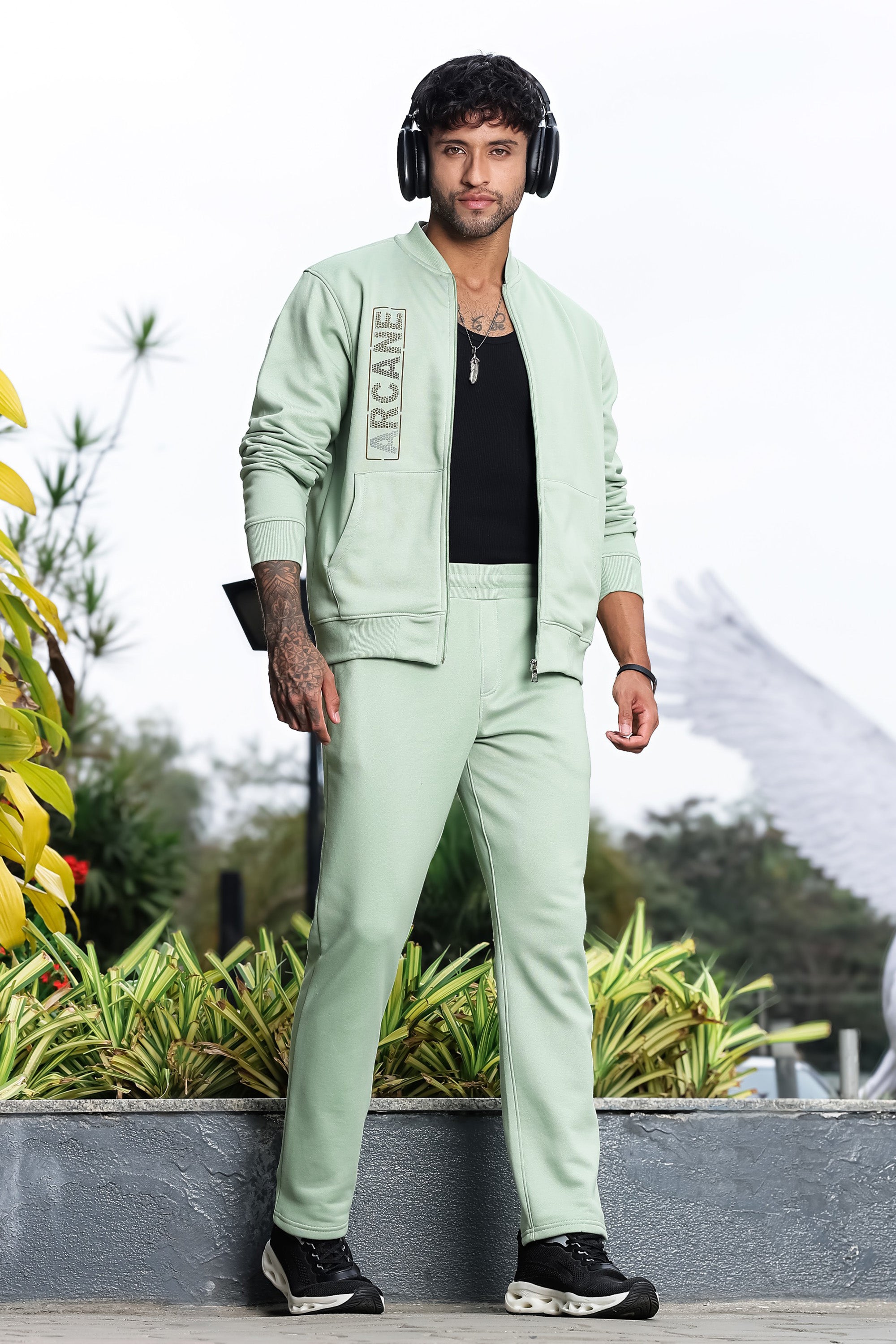 Men’s Typography Printed Tracksuit Set | Stand Collar Zip-Up Jacket & Slip-On Joggers | Cotton Blend | Mid-Rise Flat Front | 4 Pockets | Long Sleeves | Casual Athleisure