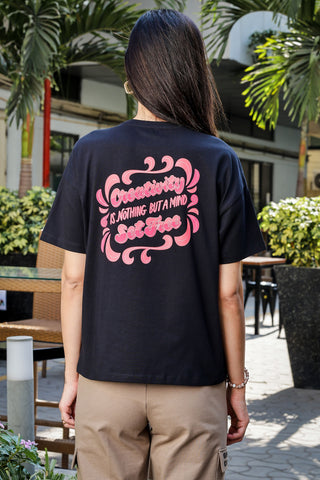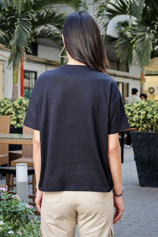 WOMEN BLACK DROP SHOULDER SLEEVES PRINTED T SHIRT
