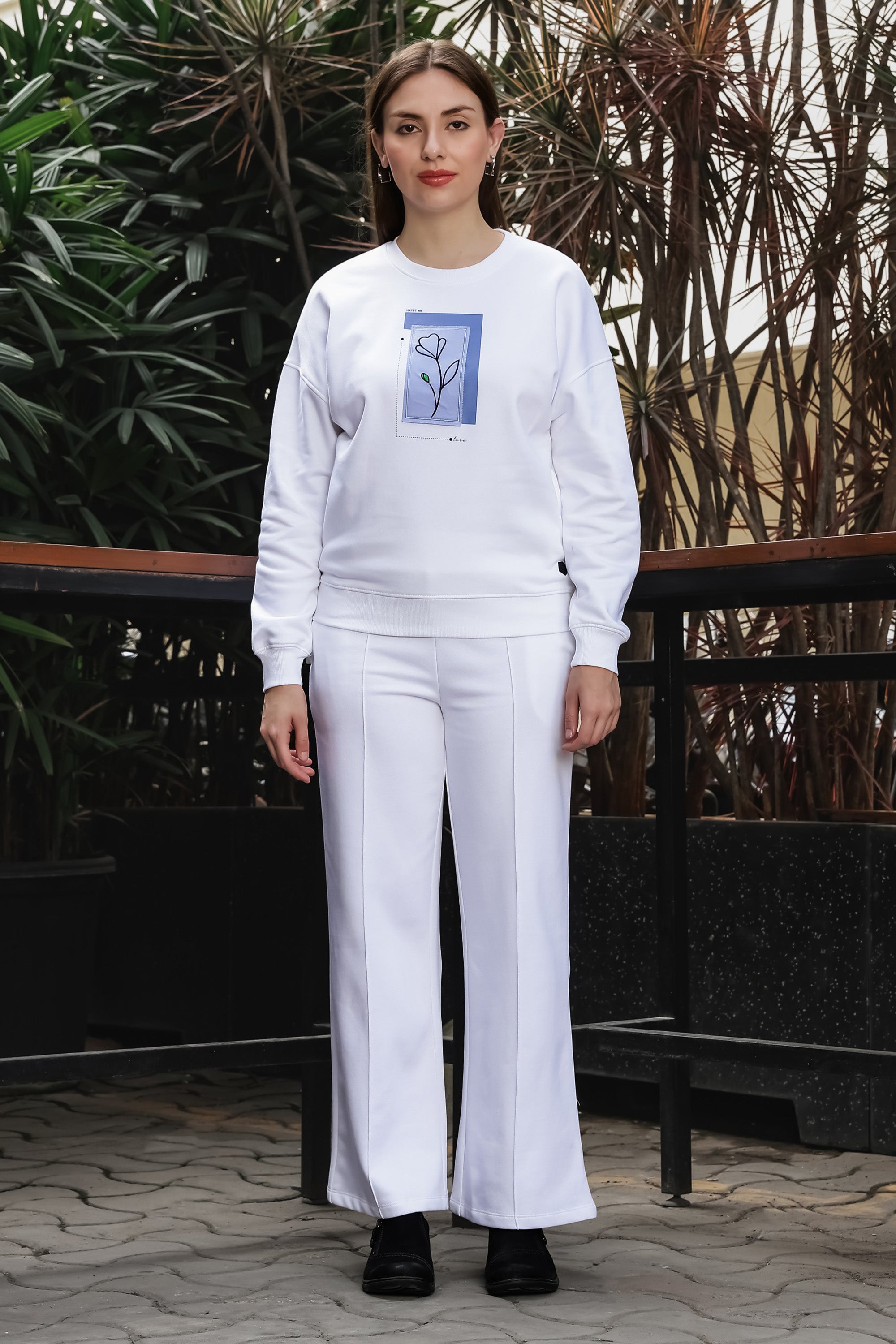 Refresh your casual wardrobe with the feminine charm of the ONE SKY Women's Embroidered & Floral Round Neck Tracksuit. Made from a breathable and flexible cotton blend (76% cotton, 19% polyester, 5% spandex), this set combines a stylish round neck, long-sleeve top featuring delicate embroidery and floral accents with mid-rise pleated slip-on pants for a flattering silhouette. With two pockets on both top and bottom, this tracksuit offers both practicality and comfort. Perfect for everyday wear, lounging, or casual outings, this co-ord set balances elegance with easy care.